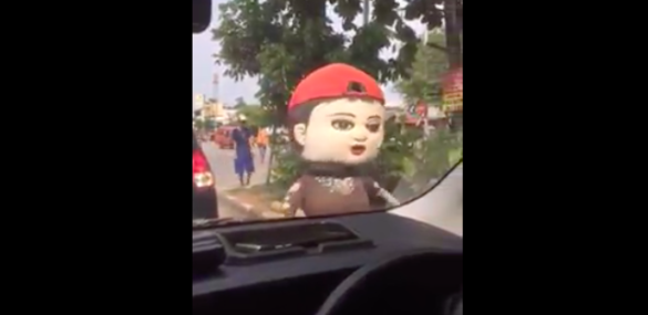 Aksi boneka berkepala besar di kemacetan satu ini sumpah creepy abis (Video)